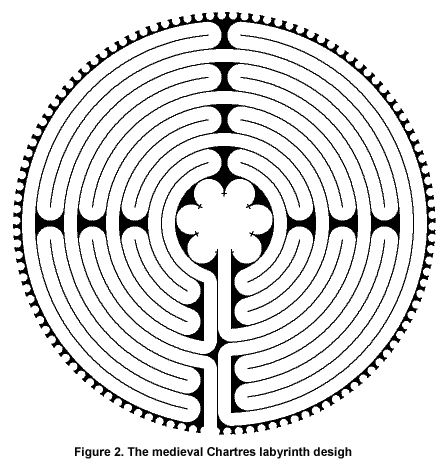 The medieval labyrinth evolved during the early Middle Ages as a church design and is set up using sacred geometry; it is usually charted and then applied to a site. It is sometimes called the Chartres labyrinth, because the design appears on the floor of this French cathedral. The medieval labyrinth is totally round and divides into four equal-sized quadrants that together form a cross. Its power comes from the act of walking it as a metaphysical journey of contemplation on Christ consciousness. The medieval labyrinth is usually entered on the west, so that the individual starts by facing east, the site of the rising sun (the risen Son). A medieval labyrinth has a more specific focus on theology: it is considered by its advocates to be a form of body prayer or walking prayer that is leading the walker to God (figure 2).