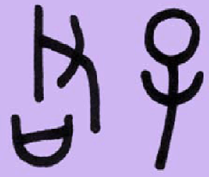 Figure 3. Junzi, the Noble One or Realizing Person, consists of jun, chief or lord, a hand holding a scepter and a mouth that speaks truth (left); and zi, son or sonhood, the figure for a child, indicating the reappearance of an ancestor spirit. It is the suffix meaning "sage" or "master" in names such as Lao-zi (or Lao-tzu), the "young-old master."